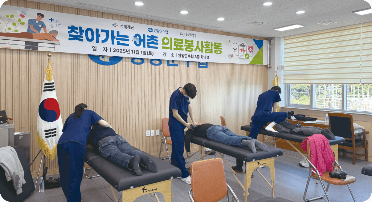 현장을 찾은 서울안강병원 의료진 10여명이 직접 도수치료, 재활상담은 물론 파마검사까지 함께 진행해 드렸습니다. 의료진은 한 분 한 분의 이야기에 귀를 기울이며, 서두르지 않고 진료를 이어갔습니다.